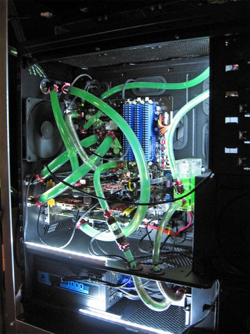 Almost everything is water-cooled: The main CPU, both video cards, the Northbridge, Southbridge, even some Mosfets.