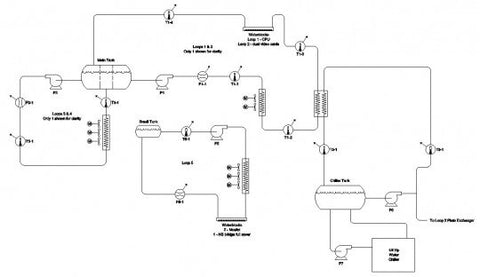 Below you will find the schematic for the cooling loops. Most PC water-cooling is accomplished with a single loop, and a simple copper heat exchanger that rests on the processor. This water-cooling schematic demonstrates 5 active cooling loops, multiple pumps and radiators, and even a chiller.