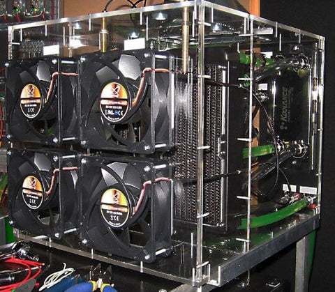 2 MCR320 QP radiator units. The 2 stands were made with aluminum angle and plate which was modeled in SolidWorks. Power supplies on the bottom with custom radiator enclosures middle.