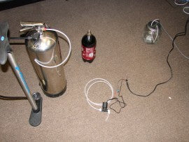 The humble beginnings of an automated bartender. When complete, it will be a system of valves controlled through a LabJack that can dispense your favorite cocktail at the press of a button. The test scenario above involves a 24V DC solenoid valve, a pressure tank filled with air to 20psi, a 2-litre bottle of Dr. Pepper, and some 1/4" nylon tubing. Next phase: Assemble a circuit to interface a LabJack with the solenoids.