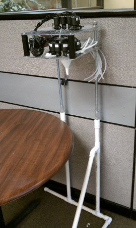 The mounting stand is comprised of 5/8" threaded rod situated in a PVC base. There are large threaded nuts at the start of the PVC to allow for height adjustment.