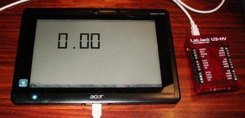 The U3-HV is connected to a reed switch and measures the RPM of a lathe, the tablet reports the speed. Future functionality will include readouts of Km/Hr, Hp etc. Read more, or download the whole Qt project on the Scooter Computer II GitHub project page.