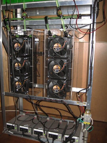 2 MCR320 QP radiator units. The 2 stands were made with aluminum angle and plate which was modeled in SolidWorks. Power supplies on the bottom with custom radiator enclosures middle.