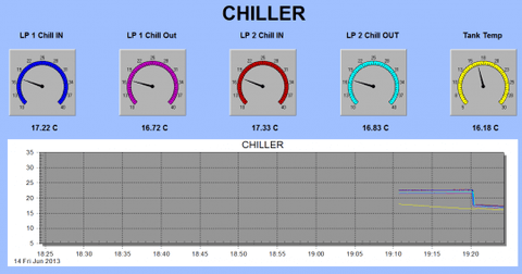 The chiller screen shows tank temp and the in/out temps that feed the plate exchangers. The graph shows the chiller running, and the drop in temperature indicates the point when the plate exchanger pump was activated.