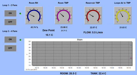 A few custom control screens inside DAQ Factory. The screenshot below shows some sensors on the chiller loop.
