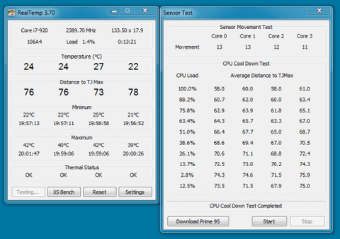In most places the water itself sits at below-ambient temperatures, and the CPU idles around 23-24C. Under a lot of load (running prime95), the CPU maxes out at 41C. For the most part, the GPU cards are the limiting component, as they run a little hotter than the CPU.